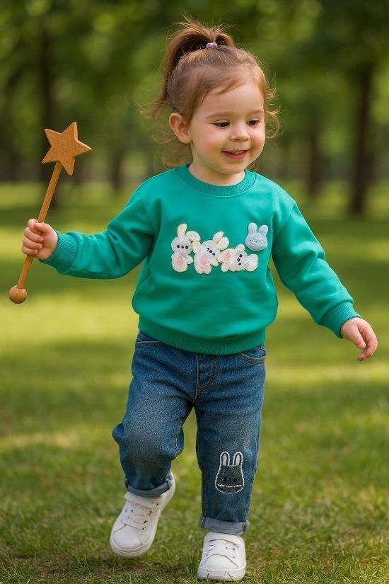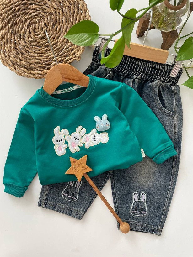 ست دوتیکه بیرونی دخترونه بلوز دورس پنبه و شلوار جین گلدوزی شده طرح خرگوش