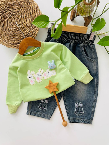 ناموجودست دوتیکه بیرونی دخترونه بلوز دورس پنبه و شلوار جین گلدوزی شده طرح خرگوش